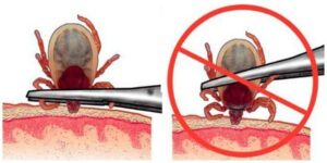 - Нельзя обрабатывать присосавшегося клеща различными маслянистыми веществами (маслом, кремом и т.п.) и агрессивными жидкостями (спиртом, бензином и т.п.) во избежание попадания содержимого кишечника клеща в рану.